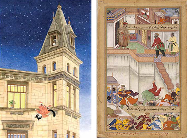 Perhaps the presence of Oriental motifs and a direct resemblance to Mughal miniatures becomes most apparent when comparing one of Anita Paegle’s “Ņau un Murr” illustrations to the book “Akbarnama” (the history of the reign of Akbar – one of the most important representations of the Great Mughal dynasty.) Although the similarities in posture and treatment of the main characters (shown falling) strikes upon first glance, the most significant similarities only reveal themselves after thorough analysis, and perhaps they are no easier to find, than the famous intermaxillary bone, found by Goethe. This particular miniature is at the Victoria and Albert Museum in London.When comparing the two images, attention immediately draws to not only the light background, but also the division of the sheet into two with a horizontal border (a cornice). This is not an insignificant detail, as the importance ancient Greeks gave to isocephaly is well known. The pupil and closest worker of C.G. Jung, Doctor of Psychology Jolande Jacobi calls the horizontal or vertical division - one of the fundamental features of the manifestations of the unconscious. The vertical division (5) indicates relational issues with the outside world (the left side – represents the soul world and the past, and the right – the objectified reality and future).