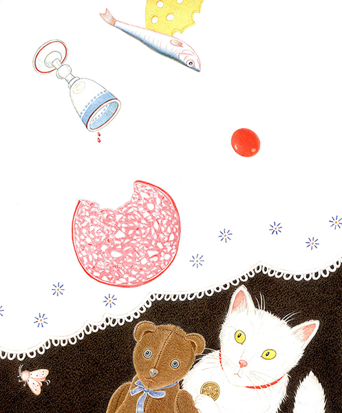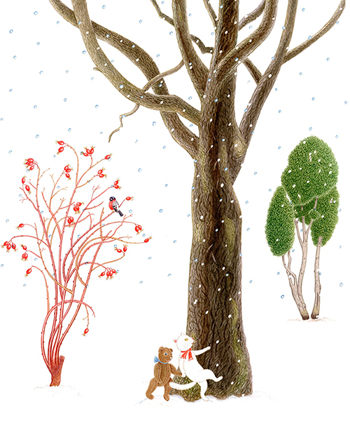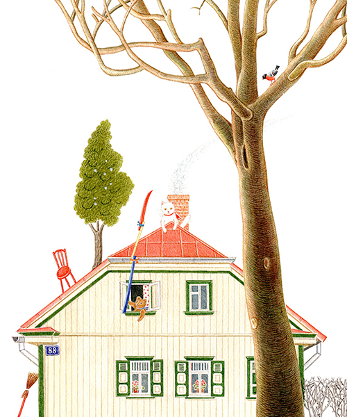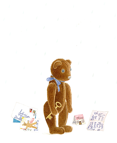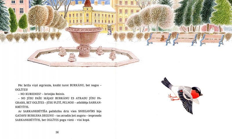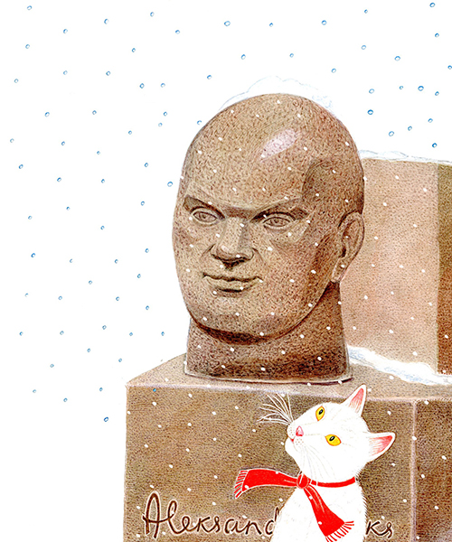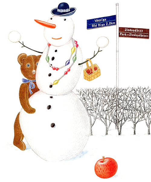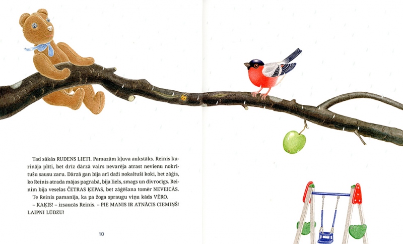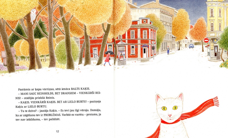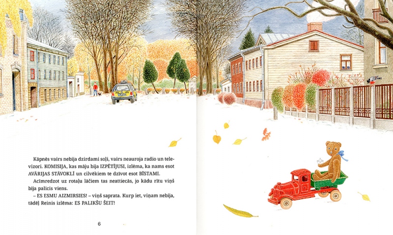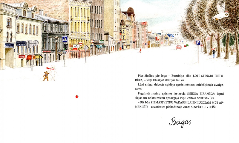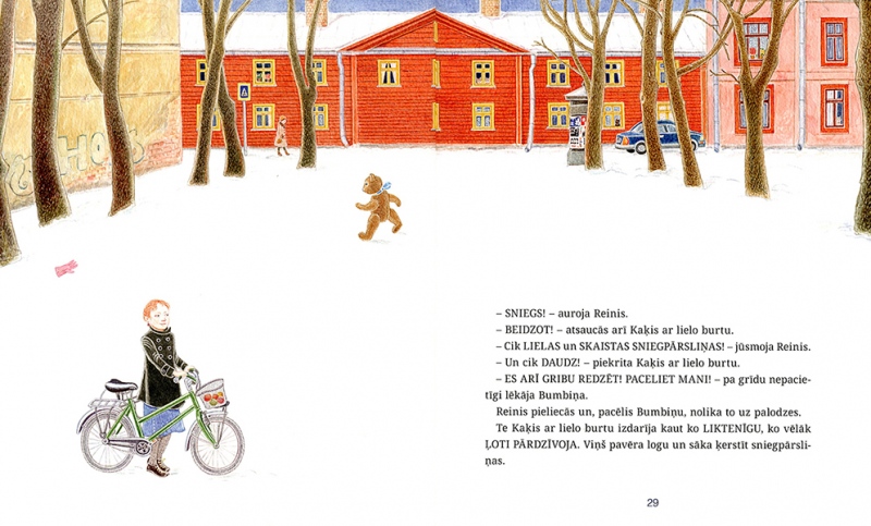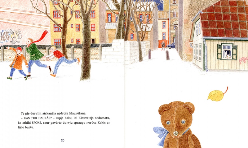 The story of ‘Winter Fairytale’ is set in Riga, in the neighbourhood of the Ziedoņdārzs park. A toy bear called Reinhold – or, as he refers to himself, Reinis – lives all by himself in an old derelict building. One day he is visited by a white cat – ‘Just Cat. With a capital C, though’ – and Reinis is no longer alone. The two of them keep house together, scare away unwelcome guests with the help of a mysterious ‘Mr Ghost’, save an uppity friend who gets stuck in a drainpipe, make a snowman and a snow pyramid and look forward to Christmas.